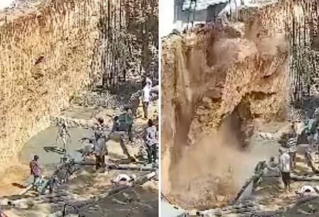 gif_animation インドにて、ホテル建設中の現場作業員らが、地下室の為の掘削作業中に発生した崩落事故によって3人死亡、他多数が負傷したニュース。現場で撮影された事故の瞬間。2つの角度から。