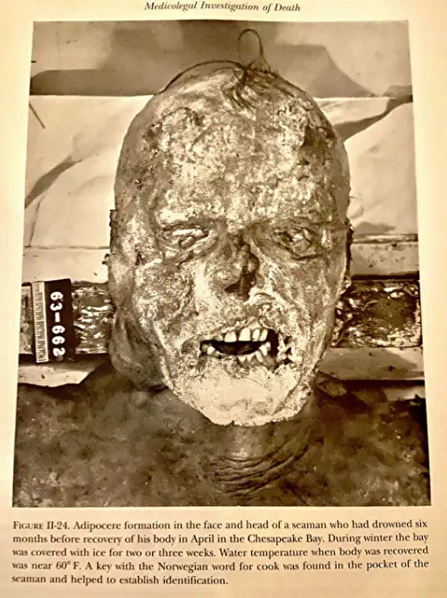 gif_animation 非常に珍しい衝撃画像1枚。米チェサピーク湾で事故により溺死したノルウェーの船員。湾は冬の間氷に覆われ、船員が発見されたのは約半年後だったというが、彼の死体は地上とはまるで違い ”死蝋化”(蝋状あるいは石鹸状になる)していたとの事。
