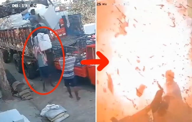 gif_animation インドにて、トラックからクラッカーを荷下ろし中に、”爆発物” とは思えないほど雑に扱ったDQNバイトのせいで大爆発が起き全員が重傷を負った衝撃映像が話題に。