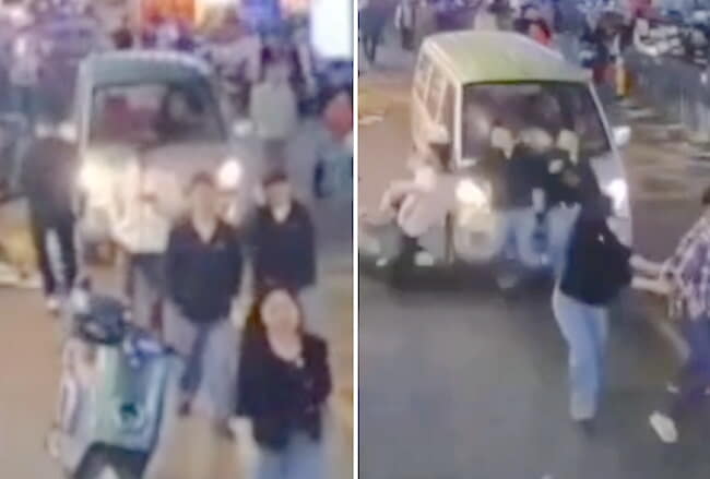 gif_animation 中国にて、人通りが多い繁華街で道を譲らない通行人にキレた運転手が人間ボウリング(人々をボウリングのピンのように轢いていく)で ”ストライク” を決めてしまう衝撃映像が話題に。この事件で5人が負傷(度合いは不明だが)したそう。