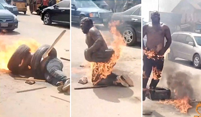 gif_animation アフリカの街中で行われた集団リンチ。タイヤネックレス(タイヤをネックレスのように首にかけ燃やす処刑方法)で ”絶対に殺したい人々” VS ”絶対に殺されたくない男” の戦い。それは最終的に男が穴に落ち、死ぬまで燃え続けた事で民衆の勝利となった(動画は中途半端な所で終わっているが)。