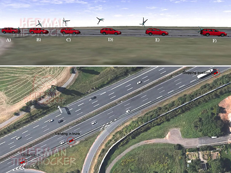 gif_animation ドイツにて、10億分の1の確率で起きた ”奇跡の事故死” がヤバすぎる動画像。高速道路を夜間に運転中、道路を横断しようとしていた79歳の男性が勢いよく撥ねられ、48メートル吹き飛ばされた後「同じ車」のトランクに落下するという事故。