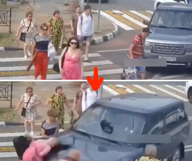 gif_animation ロシアにて、老人のドライバーが「アクセルとブレーキを踏み間違え」おじいちゃんや女性を撥ね飛ばしてしまう ”リアル人間ボウリング” 動画が話題に。この事故で少なくとも1人が死亡している。