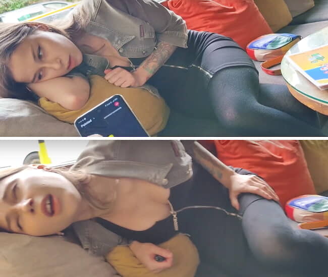 【動画】”飛びっ子デート” 中の白人美女、快感に負けて街中カフェでイキ散らすwww
