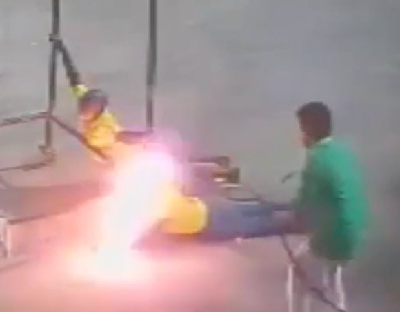 gif_animation インドにて、作業員3名が運んでいる鉄製の足場が電線に接触。「触ったら死亡する鉄の棒」と化した足場により2名が死亡する衝撃動画。救出は不可能だった…。
