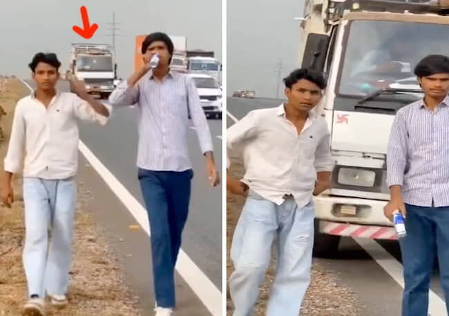 gif_animation インドにて、道路でカッコつけてインスタグラム用のショート動画を撮影していた19歳少年が、ヤバすぎる運転で突っ込んできたトラックに轢き殺される瞬間…!