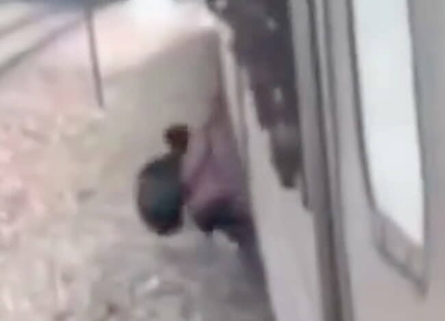 gif_animation インドにて、走行中の電車に無賃乗車しようとした若者が、ミスって電車に巻き込まれグルグルと回り死亡した恐ろしい事故の瞬間。10代前半であった?との情報も。