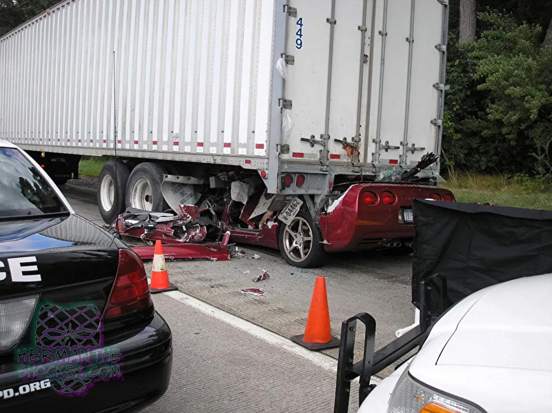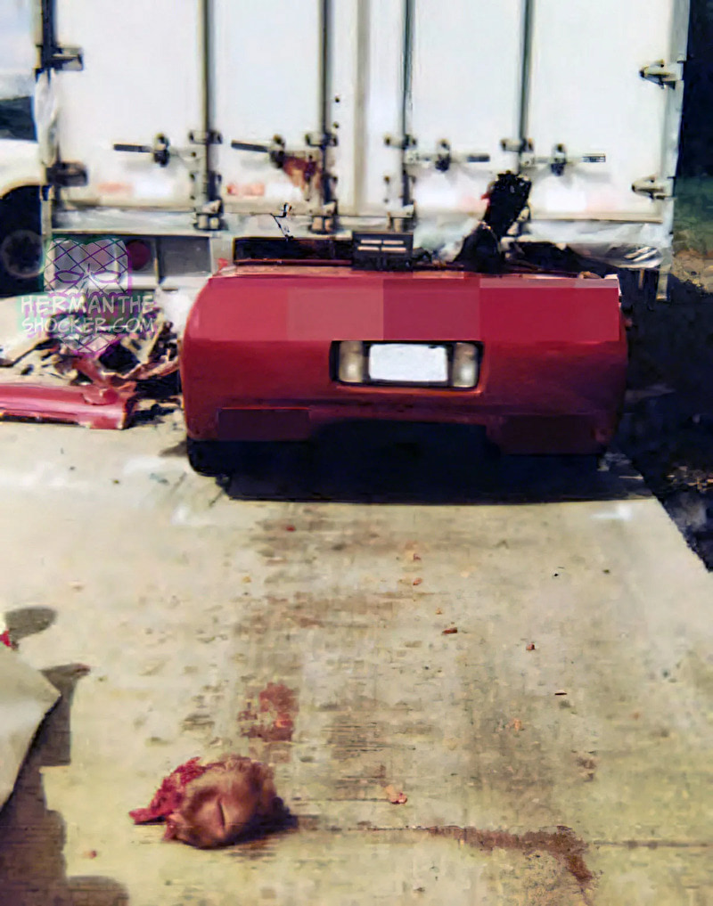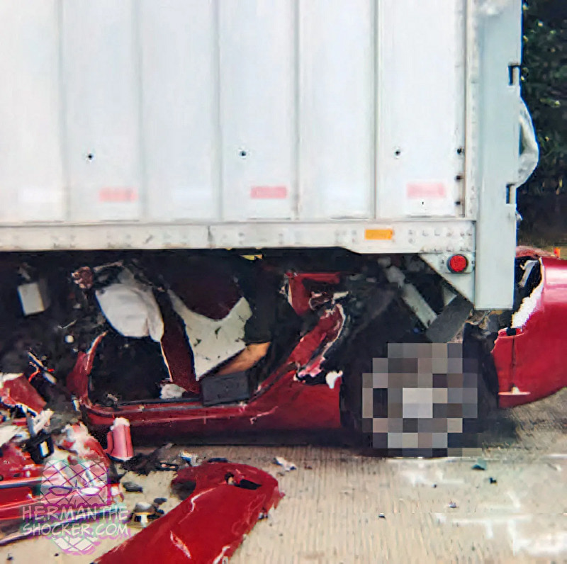 gif_animation アメリカにて、1台の車がトラックに激しく衝突する交通事故。その現場を撮影した写真で、車内、そして車の後ろを見てはいけない理由… 即死した運転手の姿。