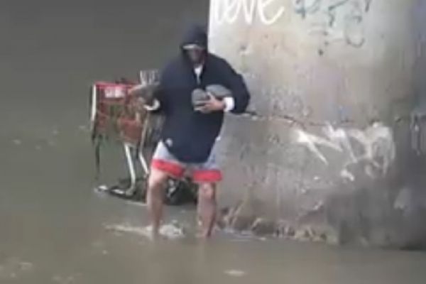 釣り竿がないんじゃない、いらないんだ![アメリカ]、ロサンゼルスの河川敷で暮らすホームレスの男。釣り竿なんて必要ない驚きの「ホームレス フィッシング」。かなり大きい魚をゲットしたようです。