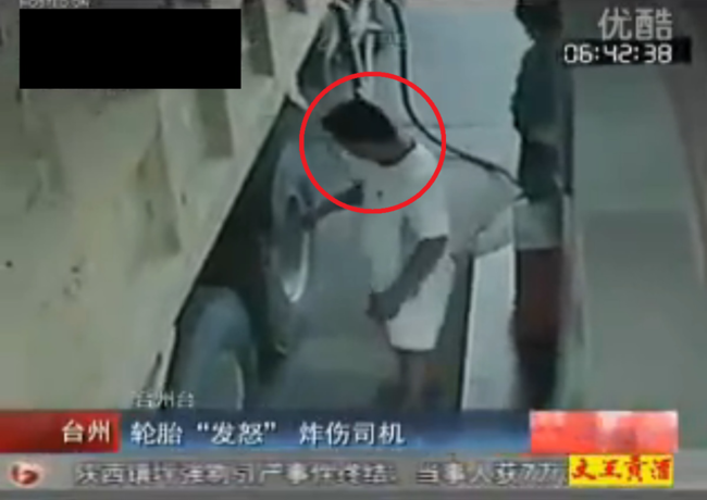 中国にて、ガソリンスタンドでタイヤのチェックをしているドライバー。しかし最悪のタイミングでタイヤは爆発、ドライバーは吹き飛ばされます。