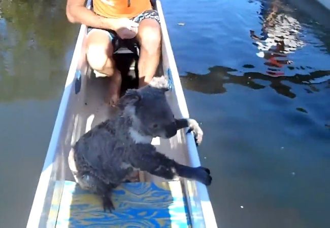 gif_animation オーストラリア・ゴールドコーストの川で、カヌーに向かって泳いできた可愛らしい侵入者。コアラの海賊。