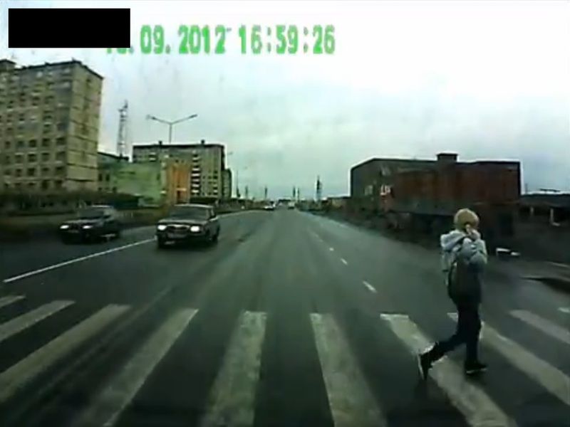 ロシアにて、携帯電話で話をしながら横断歩道を渡ろうとしていた16歳の女の子がトラックに撥ねられ重体、その瞬間の映像。