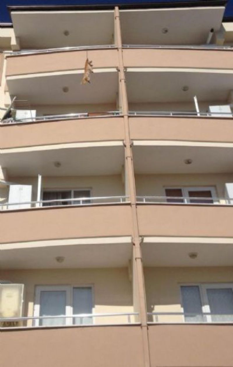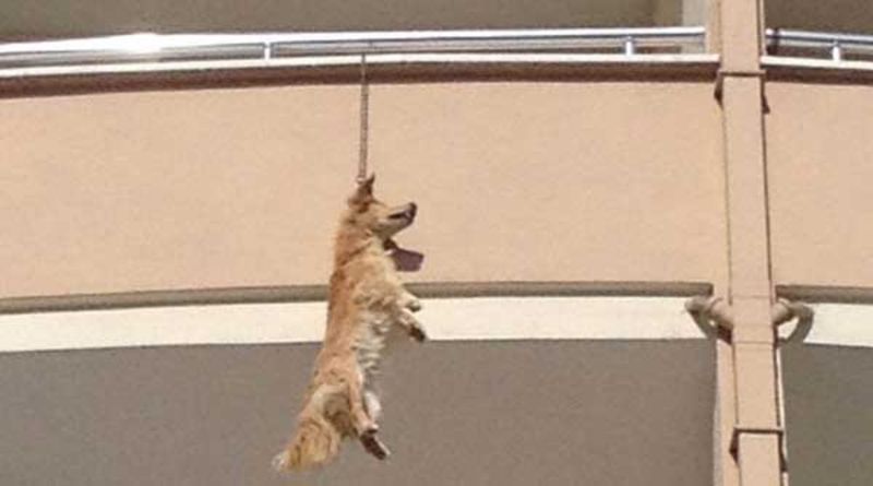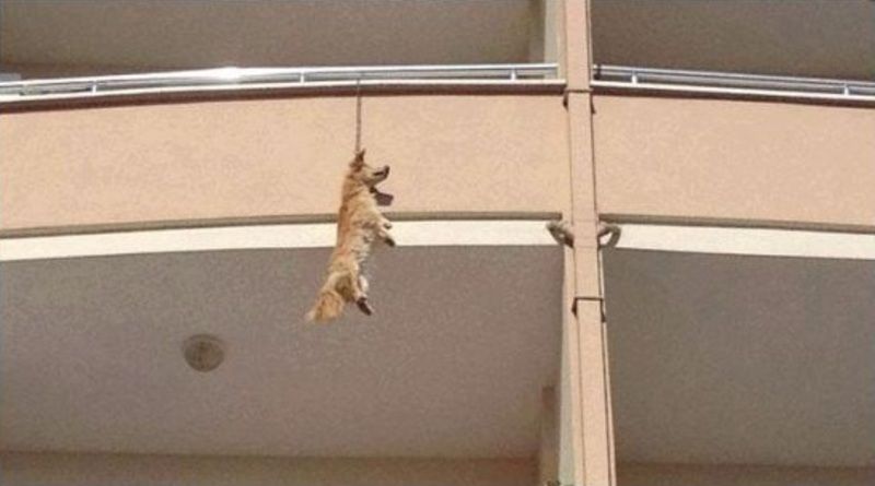 トルコにて、飼い主に放ったらかしにされていた犬がマンションのベランダから飛び降り(理由は不明)、首を吊って死亡しているという悲しい光景。