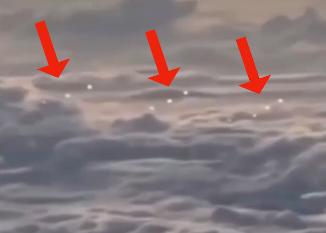 gif_animation 飛行中のパイロットが雲の上で目撃したものは、3列に並ぶ謎の飛行物体だった。よく見ると列の先頭と最後尾が規則正しく入れ替わっており、驚いた機長と副機長が「あれ、ガチもんだわ…」と言っている。飛行物体は撮影開始から40秒後 姿を消した。