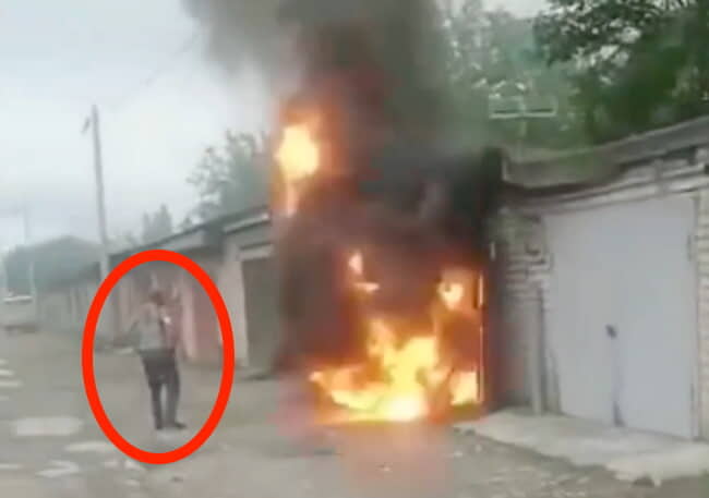 gif_animation ロシアにて、近所で発生した火災現場を見に行った(近付いた)おじさんが数秒後「ヤバすぎる姿」になってしまう衝撃動画。かなりの重傷を負ったようだ。