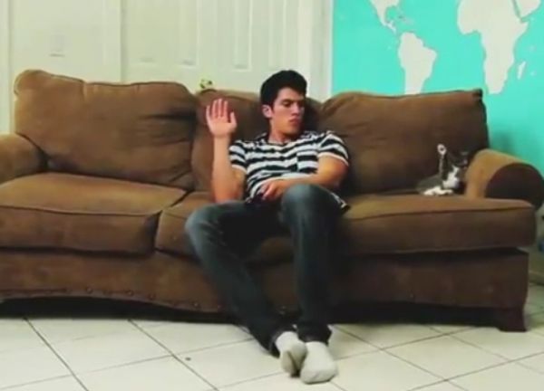 gif_animation ソファーでくつろぐ猫と、その飼い主。飼い主がチャンネルを変えようとリモコンを持つと… あれ、猫どうした?よく見ると飼い主の動きを【こっそりマネ】しています。しかも完璧、めっちゃかわいいです。