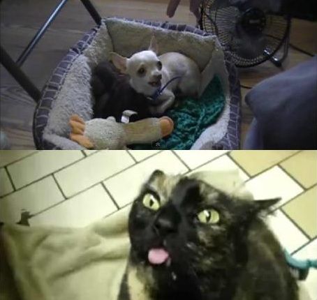 水に濡れて毛のふわふわ感がなくなった「猫」たち。可愛いようにも思えるし怖いようにも思える、微妙な見た目。