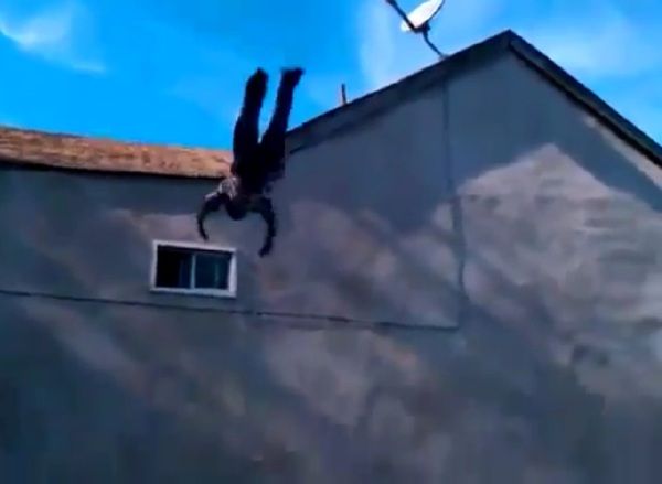 gif_animation ロシアにて、たまたま撮影された薬物中毒者2人の自殺映像。すでに横たわっている女性、それから(01:28)頃に上から落ちてくる男性。